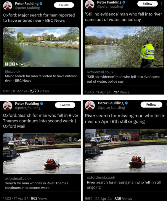 Last time he was this keen to promote an alleged river-based incident was in February 2024, supposedly for the search of a young boy in a canal that runs through Leicester’s Nature Reserve. A carefully constructed narrative to suck in the public, much of this having been previously discussed in earlier posts.