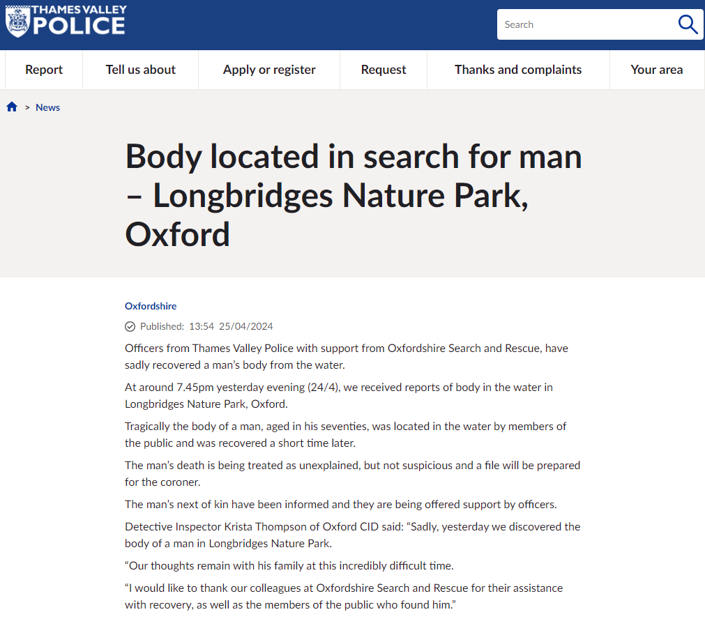 3.26pm: Identification - “Formal identification of the man will be confirmed by the coroner for Oxfordshire in due course.”