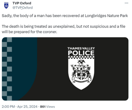 3.29pm: Appeal removed - “It is understood that Thames Valley Police has removed its appeal for information for a man who entered the water in Osney Mead on Tuesday, April 9”