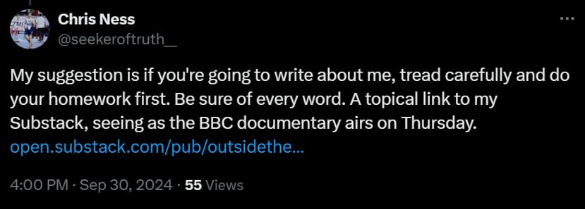 Chris, Thanks so much for sharing this with us. I've followed the BBC "Spring Offensive" against RDH since 2022 (BBC Panorama hit piece, 11 part "Hunting the Trolls" podcast followed by protracted Lawfare action against Richard D Hall) and so I'm very interested in your turn-the-tables approach. I'll be following your updates closely.