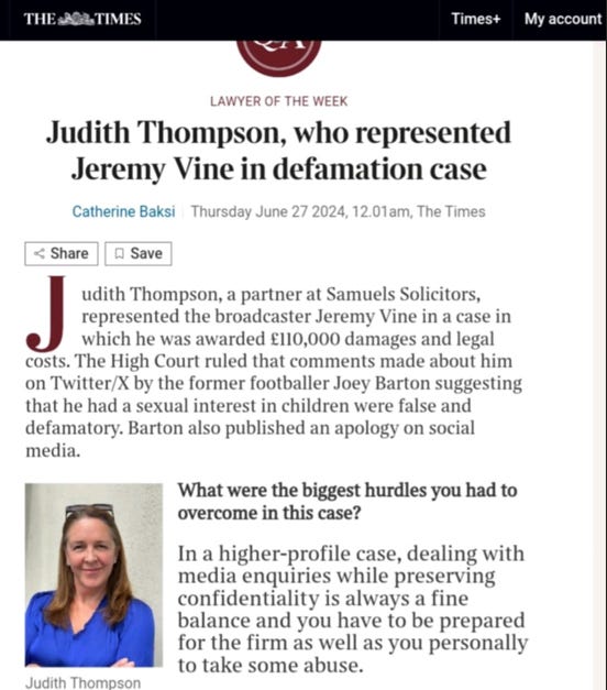 Representing the BBC heavyweight Jeremy Vine in his successful high profile libel case against Joey Barton. Impressive.👏