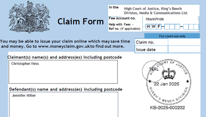 Further to my solicitor’s final request for a preference on whether to serve the claim directly or to a legal representative was ignored, the Court was instructed to issue my claim against Jennifer Miller for libel, breach of the UK GDPR / DPA 2018 and false imprisonment to her in person on 22nd Jan 2025.