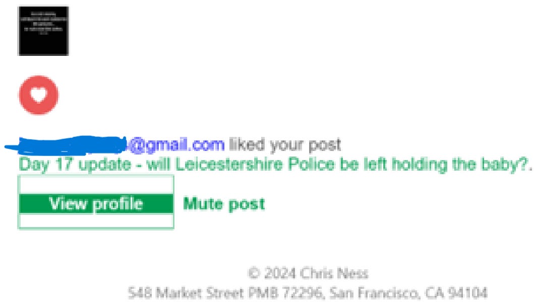 The day after my release from custody (9th Mar 2024) she likes a post that notifies me (for the first time) of her obviously faux appreciation of my work. Remarkable timing.👏