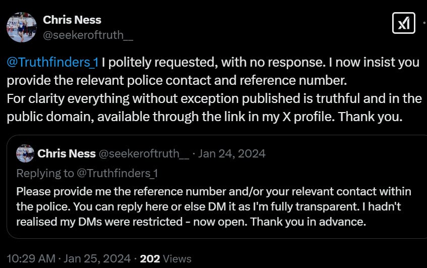 In conjunction with this warning, the next day (22nd Dec 2023) the Kent-based duo also reached out to Kent Police to report a complaint for ‘Harassment - without violence.’ It goes without saying the hatchet job to intimidate me published the prior day wasn’t handed over, and it was noted on police records at the time as ‘evidential difficulties - prevent further action.’ My interpretation is that this signified to the team a better story/script would be required.